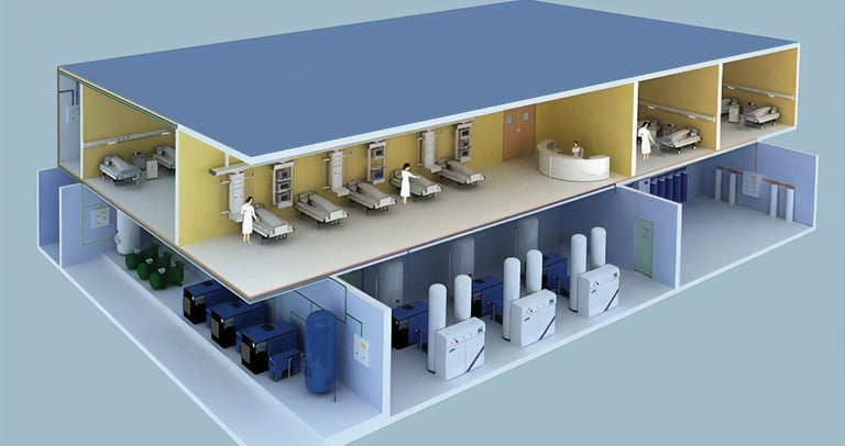 شبكات الغازات الطبية: تصميم وتنفيذ شبكات الأكسجين والهواء الطبي لعدد من المراكز الطبية والمستشفيات، والالتزام بمعايير النقاء العالمية.