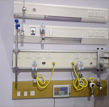 تركيب وحدات الرأس (Bedhead Units) التي تشمل مخارج الغازات، الكهرباء، والإنارة فوق أسرة المرضى.